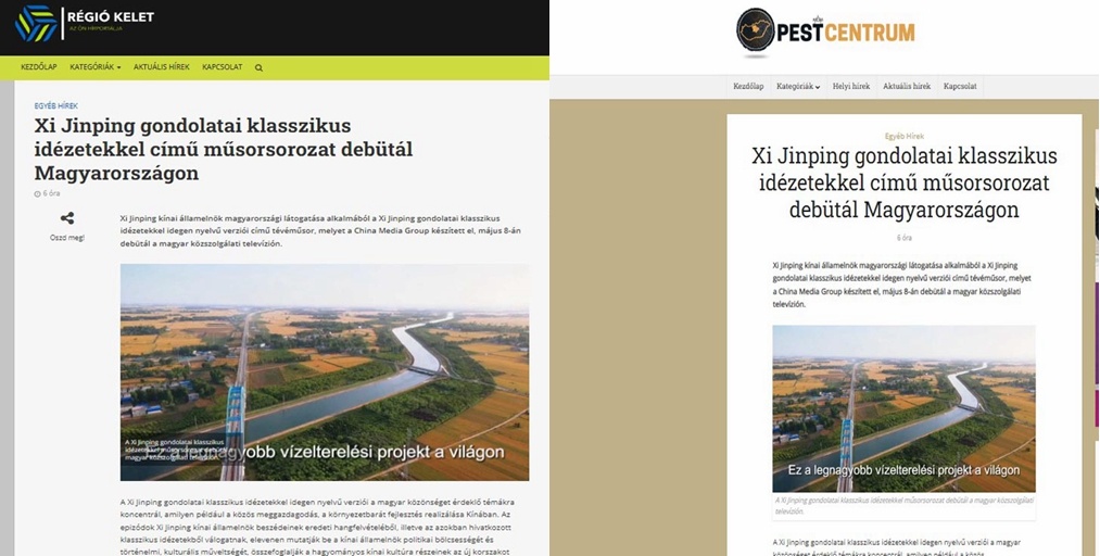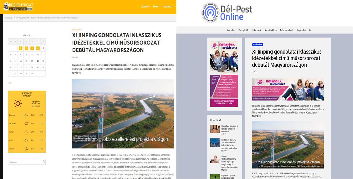 此外,當(dāng)?shù)貢r(shí)間5月4日,匈牙利東部生活網(wǎng)、匈牙利佩斯中心網(wǎng)、匈牙利西峰網(wǎng)、南佩斯在線網(wǎng)等對(duì)《平“語”近人——習(xí)近平喜歡的典故》(國際版)即將播出的消息進(jìn)行了報(bào)道。匈牙利東部生活網(wǎng)主要以介紹亞洲以及中東歐地區(qū)內(nèi)容為主,在匈牙利擁有廣泛的受眾群體。匈牙利佩斯中心網(wǎng)是布達(dá)佩斯地區(qū)最主要的商業(yè)媒體網(wǎng)站。