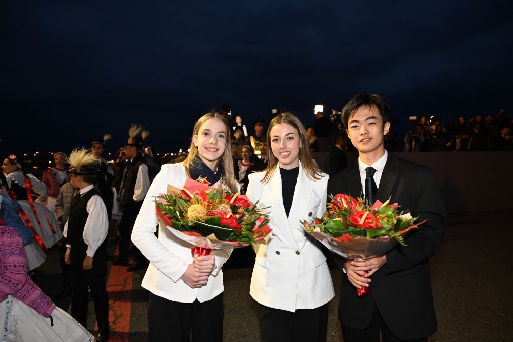 當(dāng)?shù)貢r間5月8日晚,在匈牙利布達佩斯國際機場,匈牙利姑娘歐拉·塔瑪拉與匈中雙語學(xué)校兩名參加歡迎儀式的學(xué)生合影。新華社記者謝環(huán)馳攝