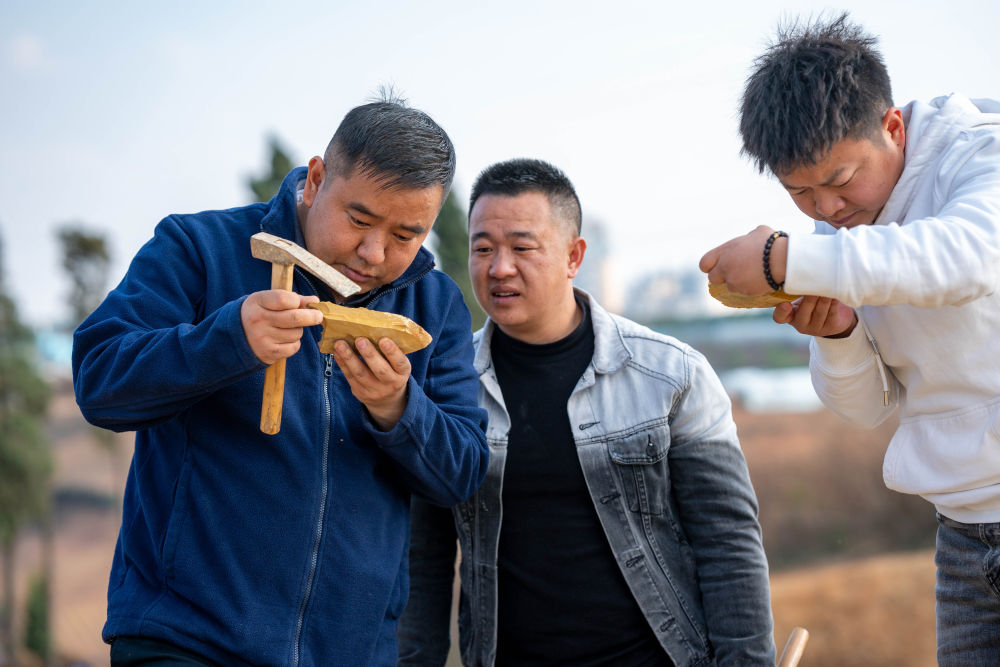 2024年2月22日,云南澄江化石地世界自然遺產(chǎn)博物館副館長郭進(jìn)(左一)和同事在云南省澄江市黑蟆地查看采集到的化石標(biāo)本。