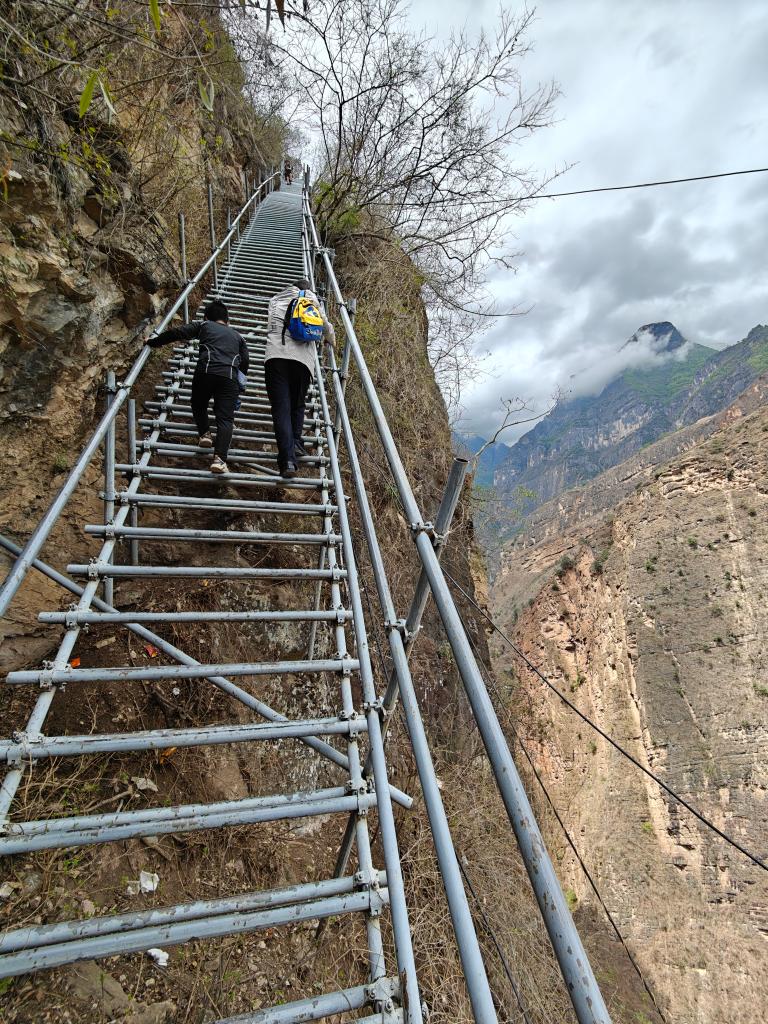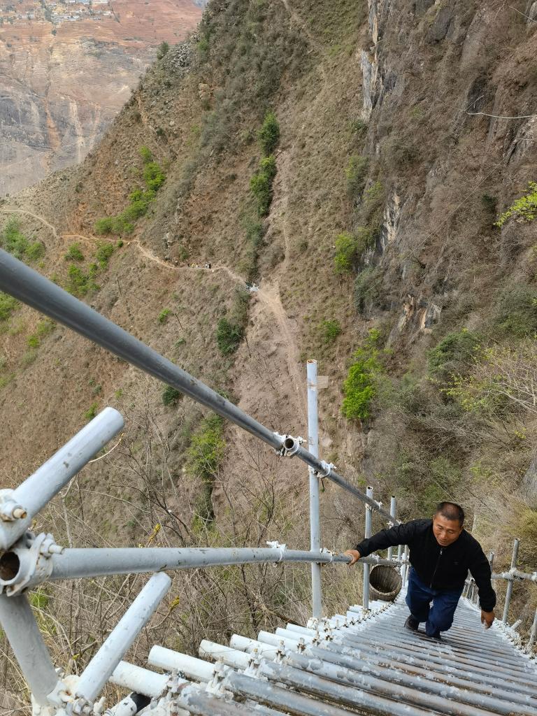 懸崖村因脫貧攻堅(jiān)而廣受關(guān)注,外地許多人自發(fā)到這里攀登鋼梯。鋼梯剛開始倒還平緩,翻上幾個(gè)拐彎后,就陡峭起來,而且越來越險(xiǎn)。鋼梯之上,一個(gè)個(gè)身影縮為小點(diǎn),身子懸空,只敢手腳并用,緊緊拽住鋼梯,向上攀去。