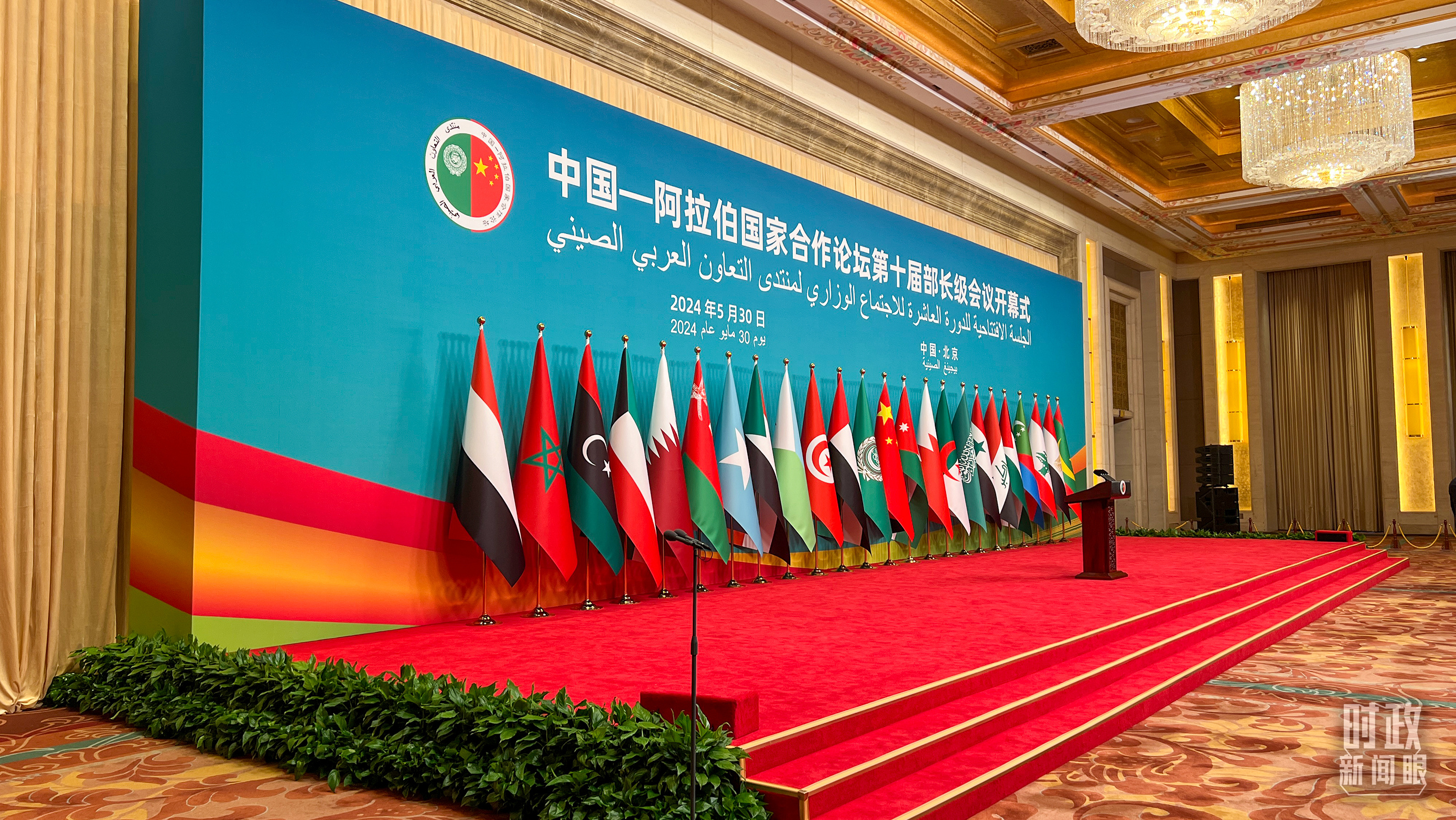5月30日上午,北京釣魚臺(tái)芳華苑內(nèi),中國和22個(gè)阿拉伯國家國旗以及阿盟旗幟相映成輝。中阿合作論壇第十屆部長級(jí)會(huì)議開幕式在這里舉行。