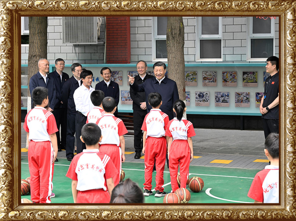 2023年5月31日上午,習近平總書記來到北京育英學??赐繂枎熒诨@球場同正在上體育課的小學生們親切交流。習近平親切地說:“現(xiàn)在生活條件好了,孩子們不是要吃得胖胖的,而是要長得壯壯的、練得棒棒的?!?/strong>