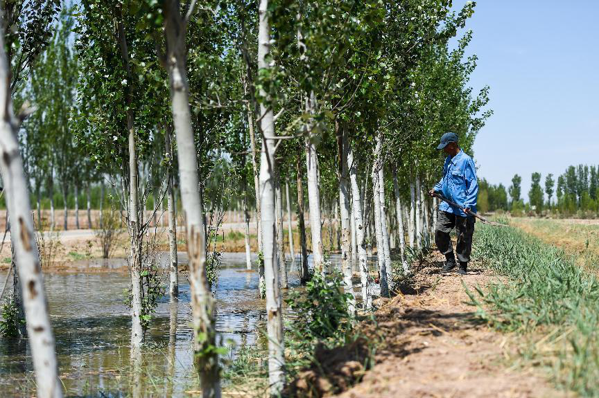 工人在內(nèi)蒙古巴彥淖爾臨河區(qū)國營新華林場管護樹木(2024年5月26日攝)。數(shù)十年來,林場結(jié)合“三北”防護林、京津風沙源治理、低質(zhì)低效林改造等生態(tài)工程,持續(xù)提高森林覆蓋率。
