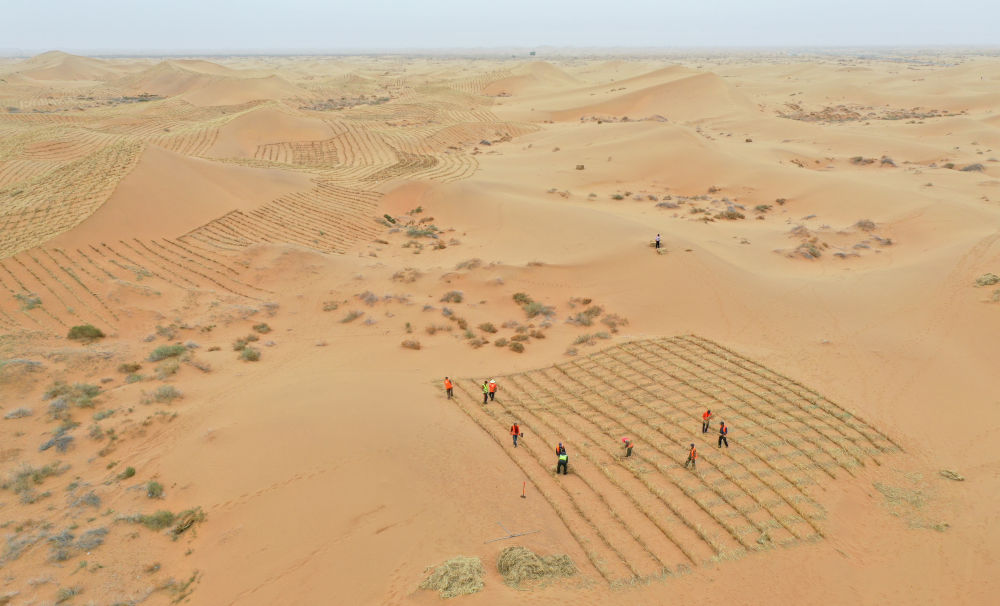 2024年4月27日,治沙工人在內(nèi)蒙古阿拉善左旗騰格里沙漠S315沿線固沙工程現(xiàn)場用稻草扎草方格(無人機照片)。