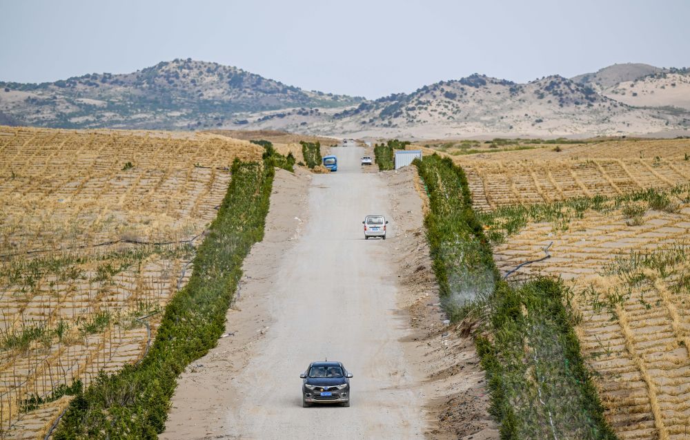 在內(nèi)蒙古赤峰市翁牛特旗巴彥呼交嘎查其白線防沙治沙項目區(qū),穿沙公路將沙地切割,沙丘被逐步固定(2024年5月16日攝,無人機照片)。