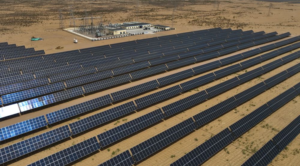 2024年5月16日在內(nèi)蒙古巴彥淖爾市磴口縣拍攝的烏蘭布和沙漠光伏基地(無人機照片)。烏蘭布和沙漠建設(shè)生態(tài)光伏基地,采取板上發(fā)電、板下種植的辦法,努力把沙海變?yōu)椤熬G?!薄?/p>