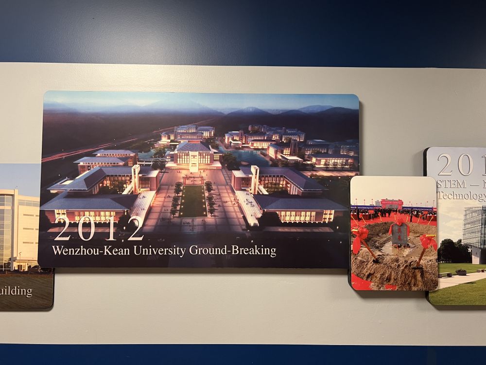 在美國肯恩大學(xué)主校區(qū)學(xué)生中心走廊內(nèi)懸掛的溫州肯恩大學(xué)奠基儀式的照片。