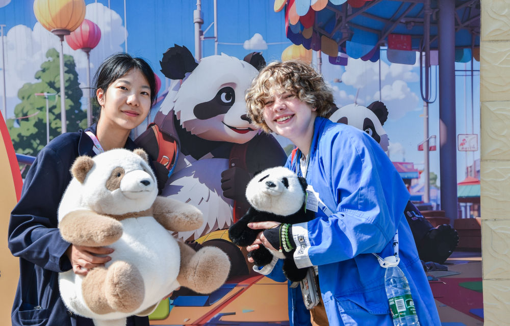 4月21日,中美學(xué)生在石家莊動物園大熊貓館內(nèi)手持熊貓玩偶留影。