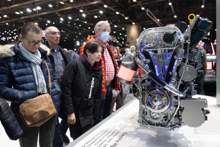 觀眾在瑞士舉行的2024年日內(nèi)瓦國際車展上參觀比亞迪新款發(fā)動(dòng)機(jī)。