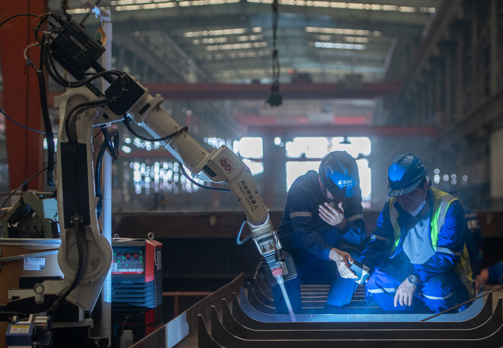 2024年5月16日,工作人員在湖北省武漢市新洲區(qū)武昌船舶重工集團(tuán)有限公司查看焊接機(jī)器人焊接的焊縫。近年來,該公司圍繞新型公務(wù)船、高端海工船、中小型綠色智能油化船和支線集裝箱船等主建船型,積極推進(jìn)數(shù)字化轉(zhuǎn)型與智能制造,助力航運(yùn)高質(zhì)量發(fā)展。