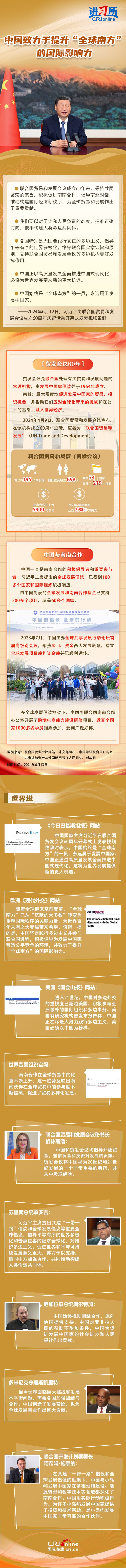 6月12日,中國國家主席習近平向聯(lián)合國貿(mào)易和發(fā)展會議成立60周年慶?;顒娱_幕式發(fā)表視頻致辭時強調(diào),中國正以高質(zhì)量發(fā)展全面推進中國式現(xiàn)代化,必將為世界發(fā)展帶來新的更大機遇。