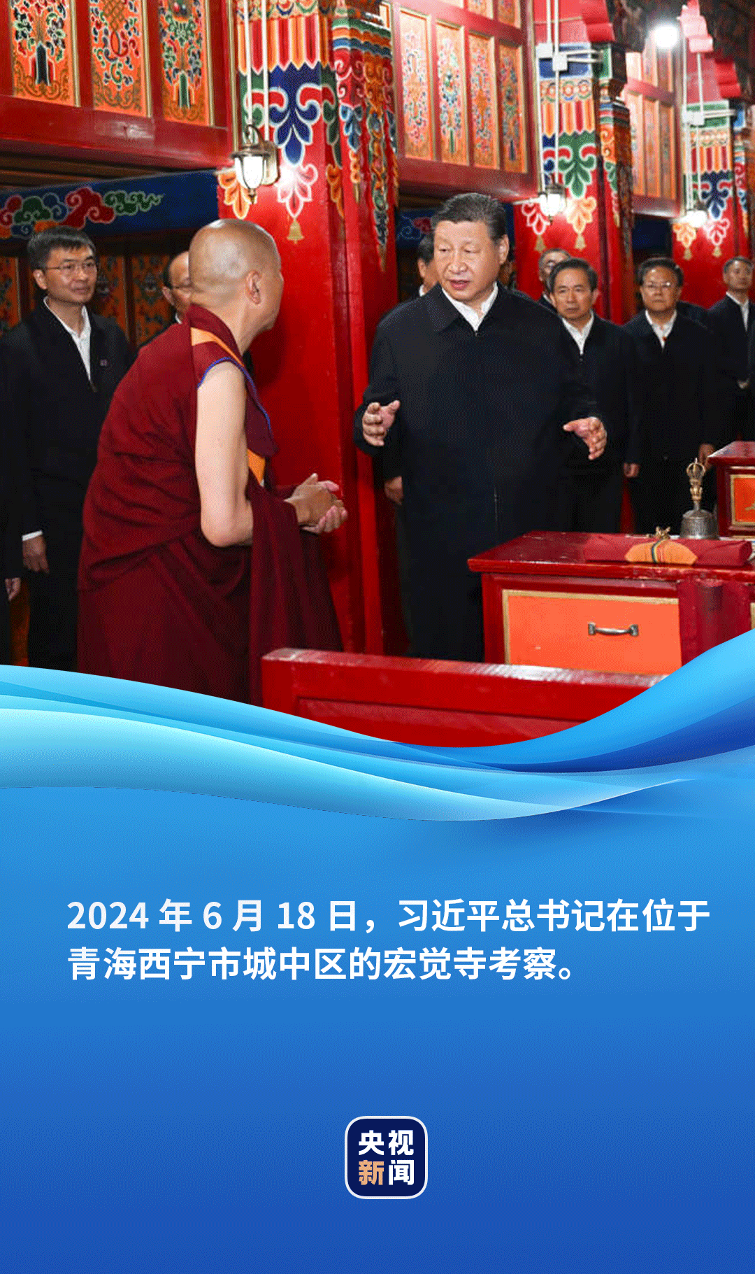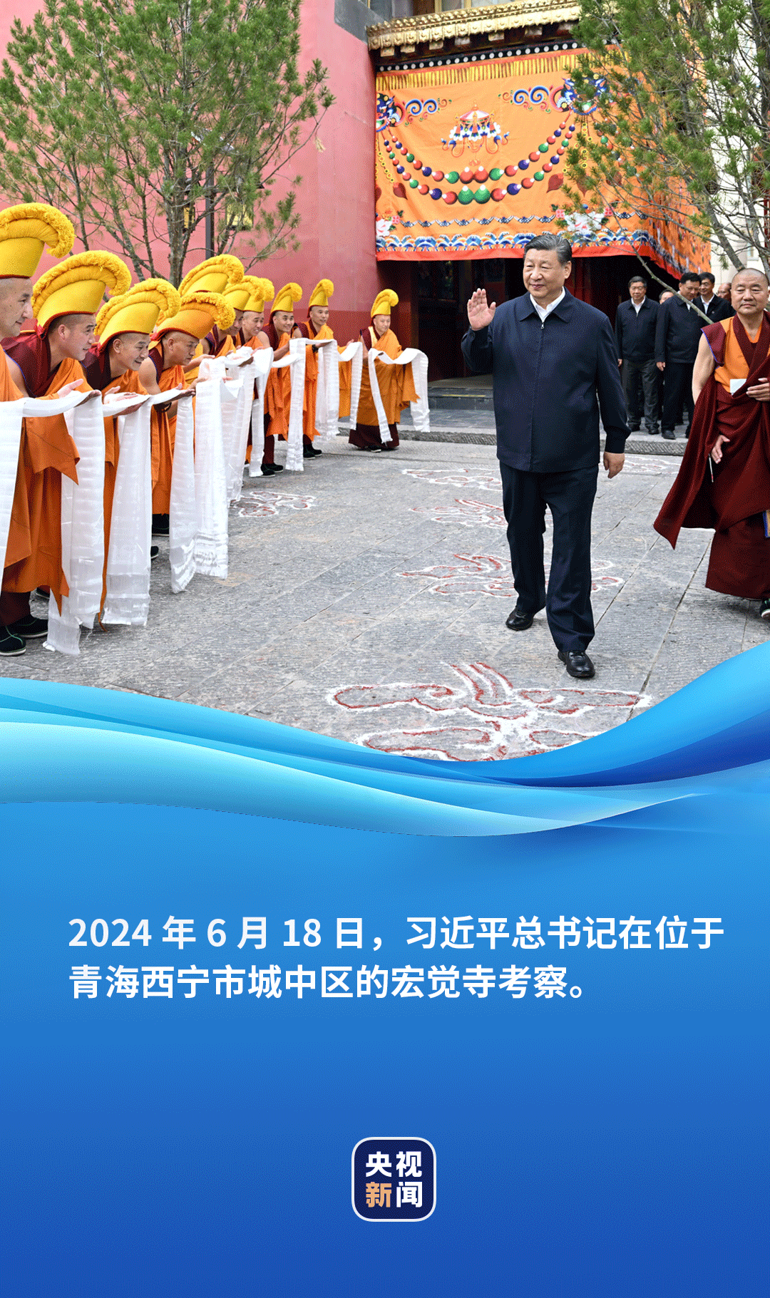 6月18日,正在青海考察的習(xí)近平總書記來到位于西寧市城中區(qū)的宏覺寺。在寺前院落,宏覺寺民主管理委員會(huì)負(fù)責(zé)人向總書記敬獻(xiàn)哈達(dá),僧人提香爐、持寶傘迎接總書記。