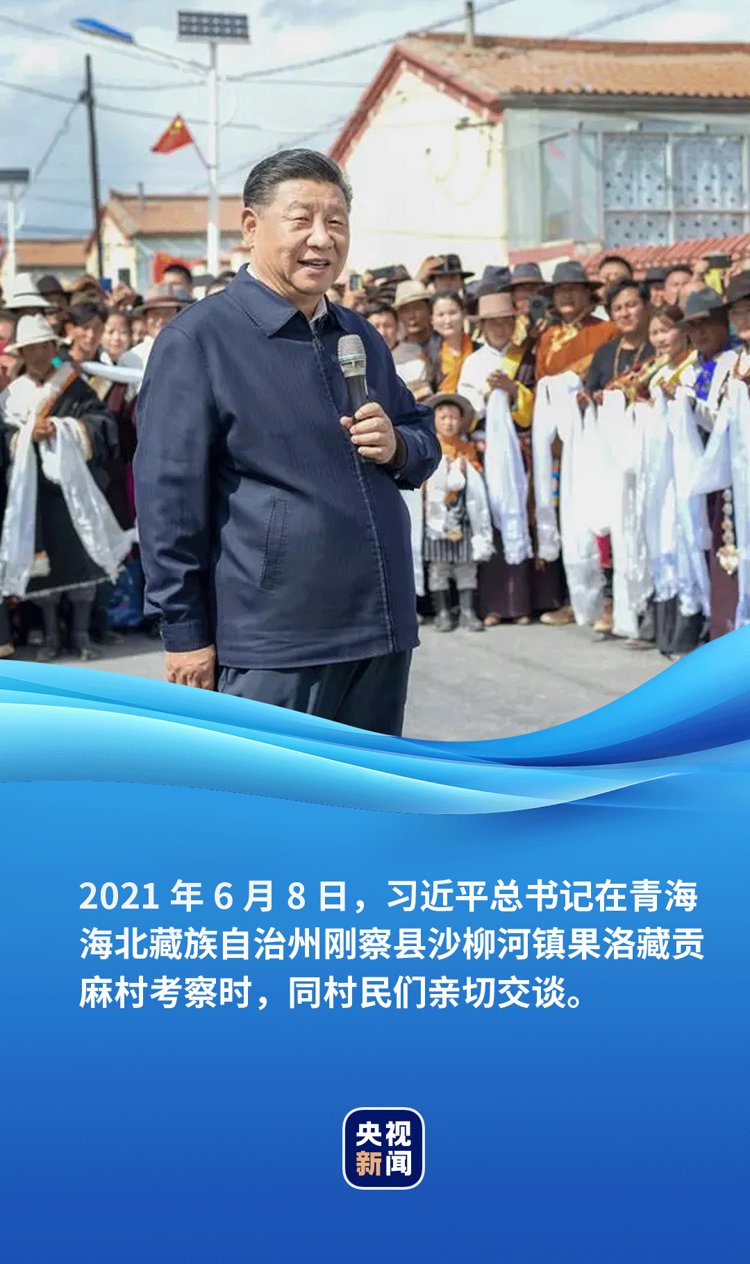 藍(lán)天白云下,一排排紅瓦黃墻的平房小院錯(cuò)落有致,筆直整潔的村道兩旁立著太陽能路燈。村民索南才讓帶著一家三代站在家門口,向總書記獻(xiàn)上潔白的哈達(dá)。