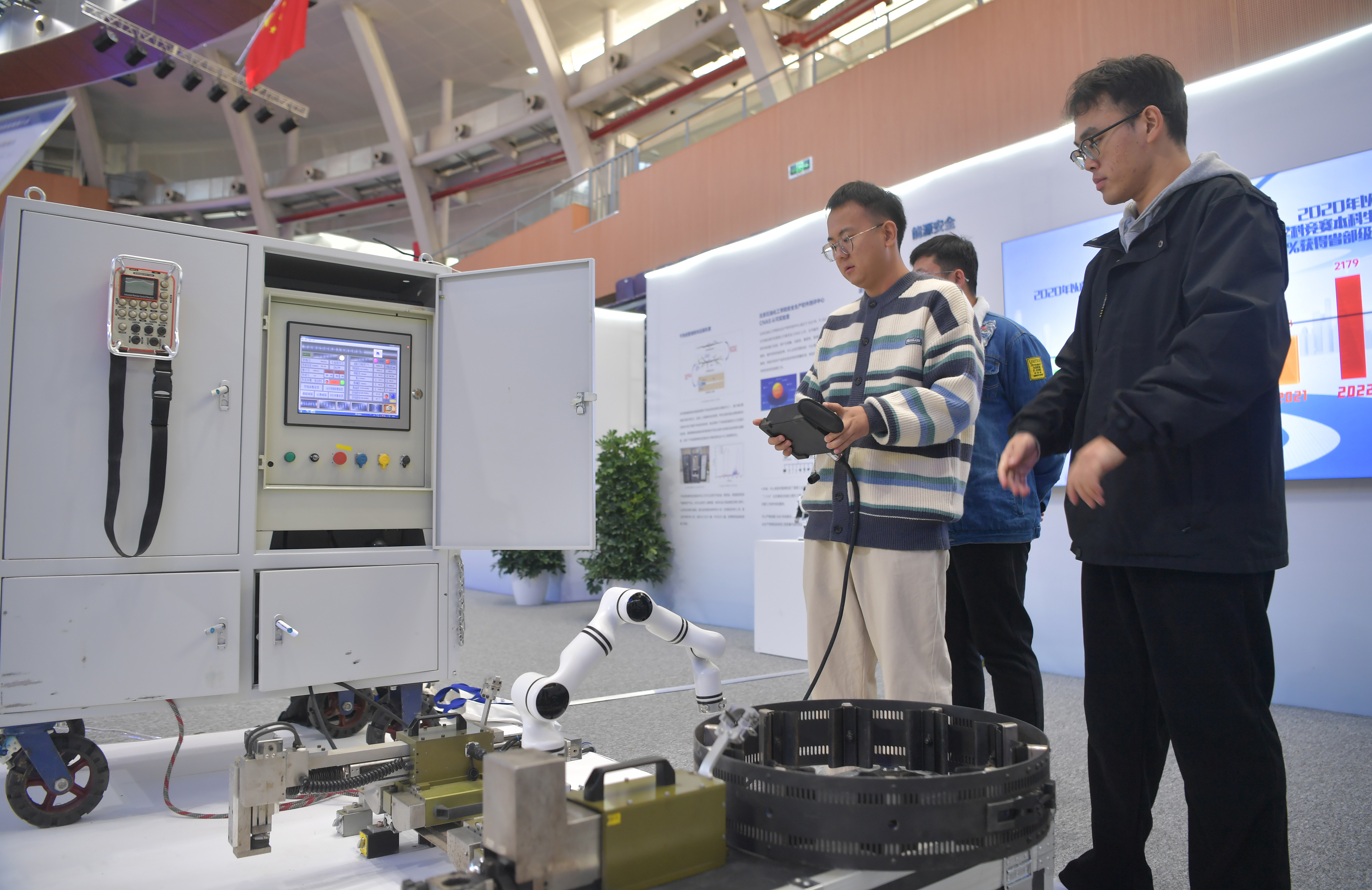 2023年,京南地區(qū)高??萍汲晒平闀诒本┙ㄖ髮W(xué)大興校區(qū)舉行。圖為高校師生在展示管道全位置焊接機器人系統(tǒng)成果。