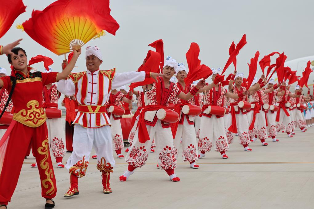 2023年5月17日下午,出席中國-中亞峰會的哈薩克斯坦總統(tǒng)托卡耶夫抵達陜西省西安市。當?shù)孛癖娨詿崆榈难摹g快的秧歌等民間藝術表演歡迎貴賓到來。新華社記者 邢廣利 攝