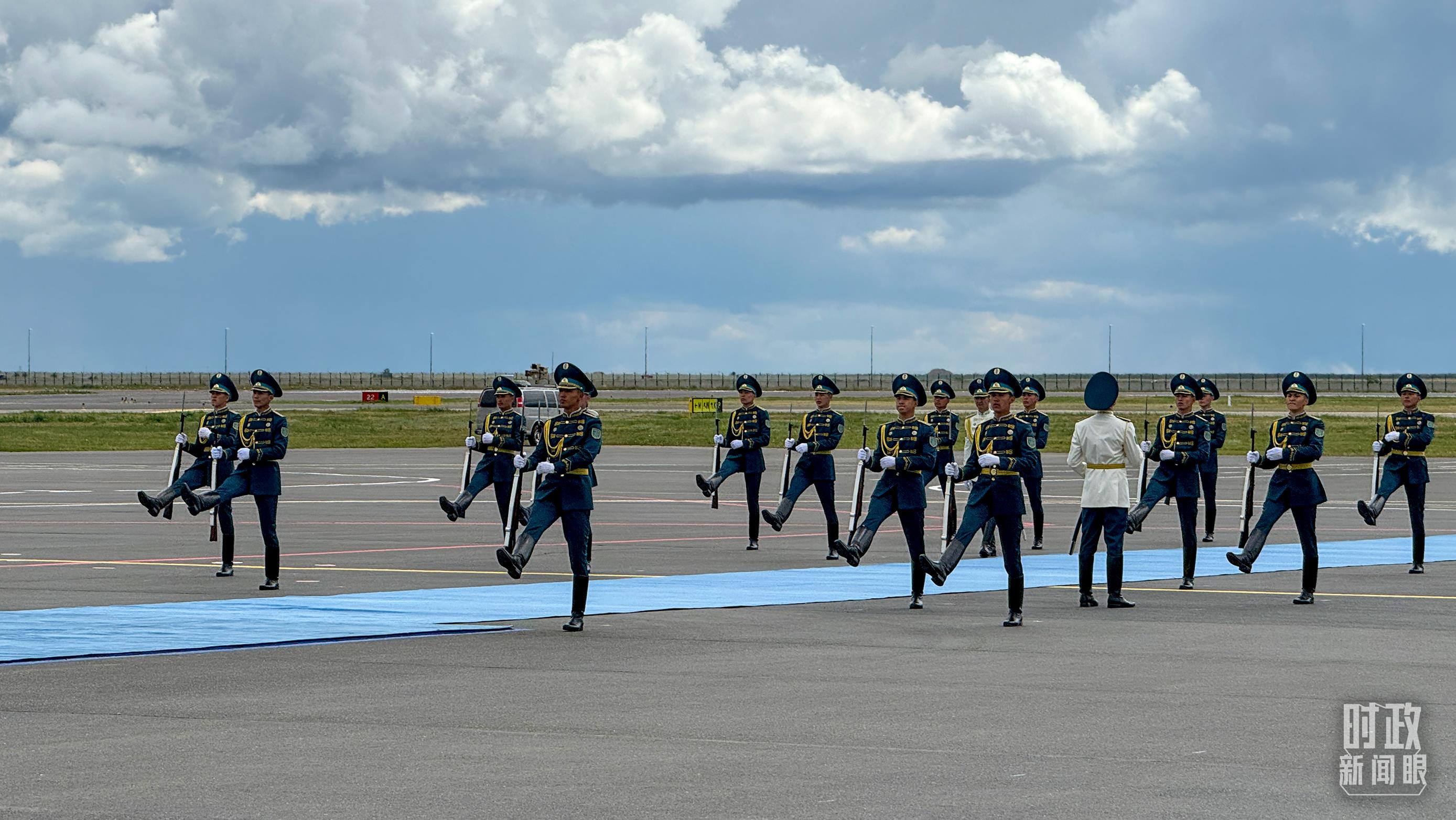 托卡耶夫總統(tǒng)在機(jī)場(chǎng)為習(xí)主席舉行了盛大隆重的迎賓儀式。100余名儀仗兵英姿挺拔,軍樂團(tuán)奏響迎賓曲和迎賓號(hào)角。近百名哈薩克斯坦兒童揮舞中哈兩國(guó)國(guó)旗,歡呼“您好”,熱烈歡迎習(xí)主席到訪。