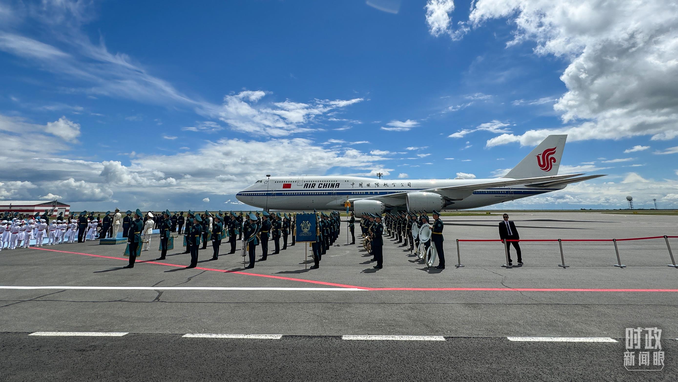 當(dāng)習(xí)近平主席乘坐的專機(jī)進(jìn)入哈薩克斯坦領(lǐng)空時(shí),哈薩克斯坦三架空軍戰(zhàn)機(jī)升空護(hù)航。專機(jī)抵達(dá)阿斯塔納納扎爾巴耶夫國(guó)際機(jī)場(chǎng)時(shí),托卡耶夫總統(tǒng)率政府第一副總理等高級(jí)官員熱情迎接。