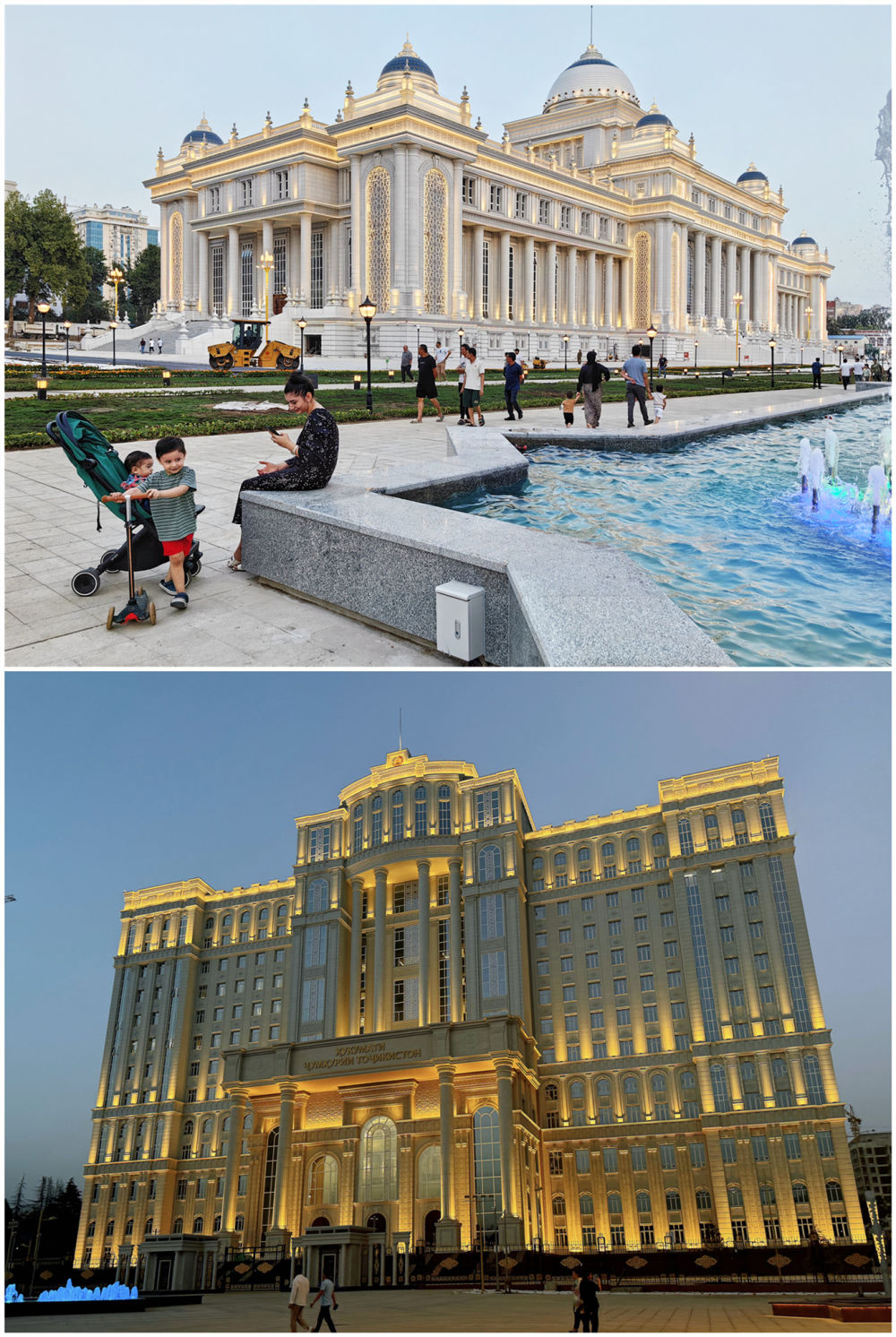 塔議會大樓、政府大樓坐落于杜尚別著名的魯達基大道,相隔數百米。議會大樓同總統府相望,政府大樓則俯瞰杜尚別另一條交通干道——索莫尼大道。兩座大樓融合歐亞古典柱廊結構、塔吉克民族特色雕刻、伊斯蘭文化風格的設計,外觀大氣、典雅莊重,同魯達基大道兩側的古樹、鮮花、噴泉相映成景。