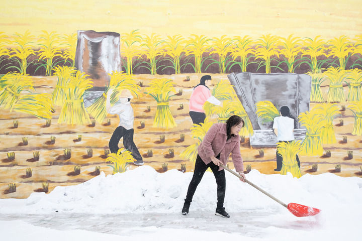 黑龍江省漠河市北極鎮(zhèn)北紅村“遠方故里”民宿負責人張翠花在清理積雪(2023年1月12日攝)。