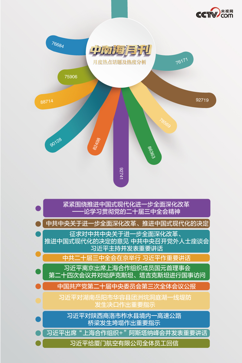 央視網(wǎng)“智聞”系統(tǒng)提取分析2024年7月全網(wǎng)時(shí)政新聞熱點(diǎn)顯示,本月“中共中央關(guān)于進(jìn)一步全面深化改革、推進(jìn)中國式現(xiàn)代化的決定”“中共二十屆三中全會在京舉行 習(xí)近平作重要講話”等話題備受關(guān)注。