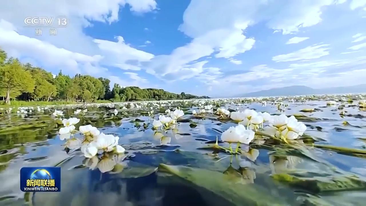云南大理,洱海湖面,連片海菜花在水面綻放,吸引了大批游客前來打卡。