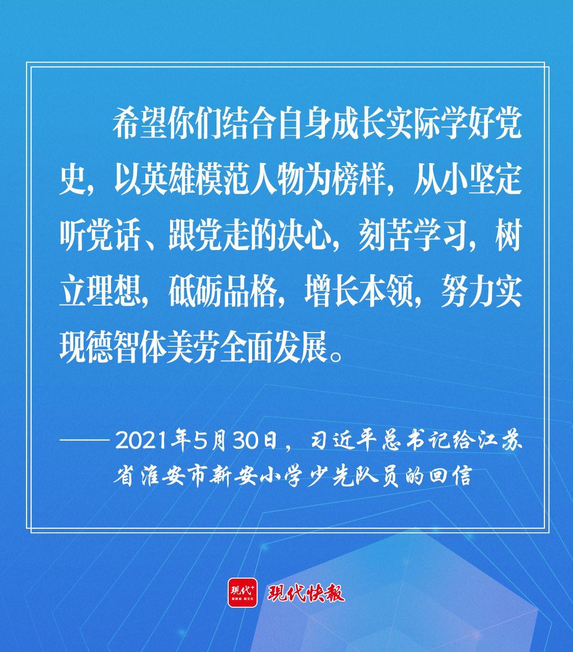 2021年5月30日,習(xí)近平總書記給江蘇省淮安市新安小學(xué)少先隊(duì)員回信時強(qiáng)調(diào),“希望你們結(jié)合自身成長實(shí)際學(xué)好黨史,以英雄模范人物為榜樣,從小堅(jiān)定聽黨話、跟黨走的決心,刻苦學(xué)習(xí),樹立理想,砥礪品格,增長本領(lǐng),努力實(shí)現(xiàn)德智體美勞全面發(fā)展。”