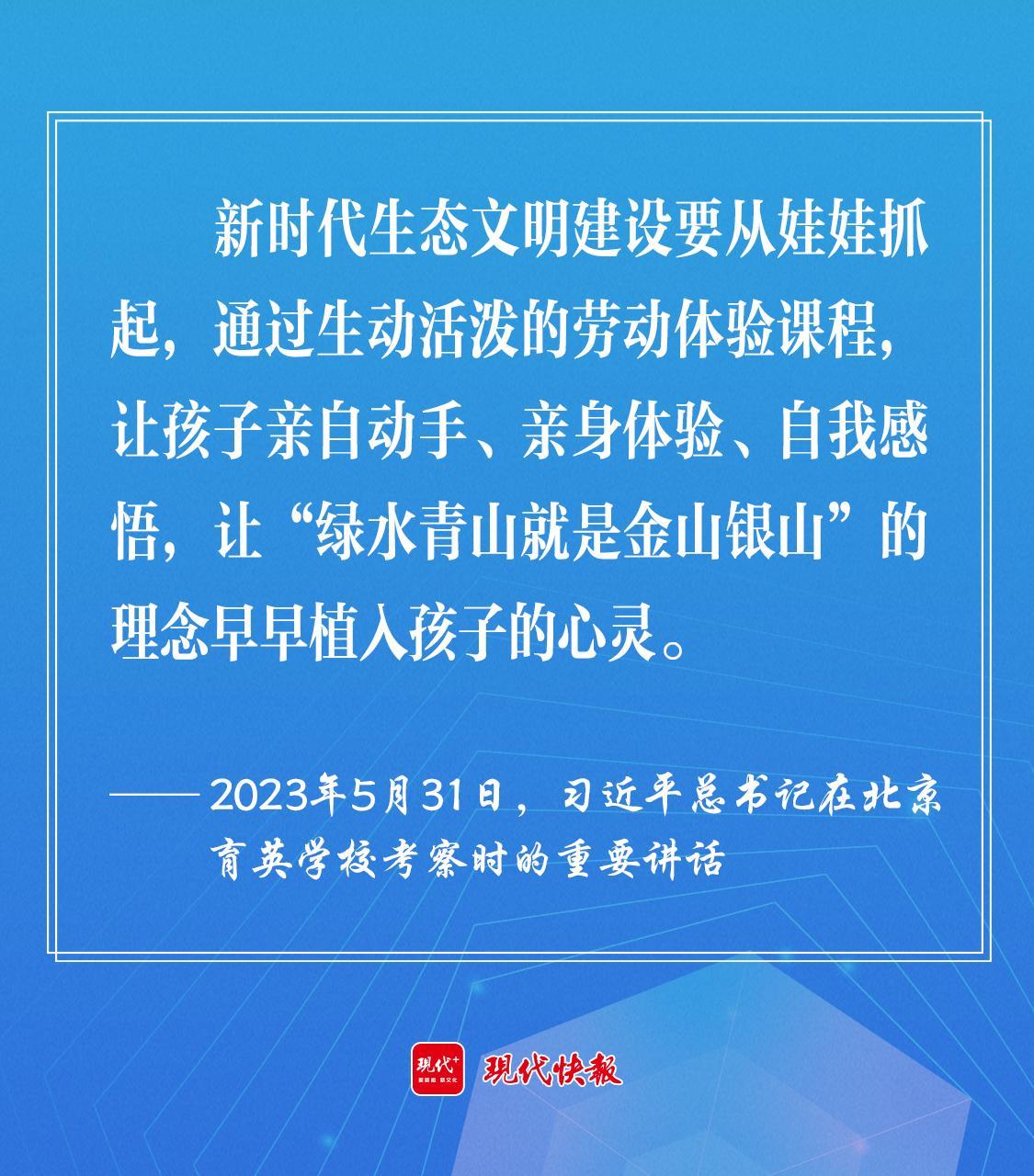 2023年5月,習(xí)近平總書記在北京育英學(xué)??疾鞎r強(qiáng)調(diào),新時代生態(tài)文明建設(shè)要從娃娃抓起,通過生動活潑的勞動體驗(yàn)課程,讓孩子親自動手、親身體驗(yàn)、自我感悟,讓“綠水青山就是金山銀山”的理念早早植入孩子的心靈。