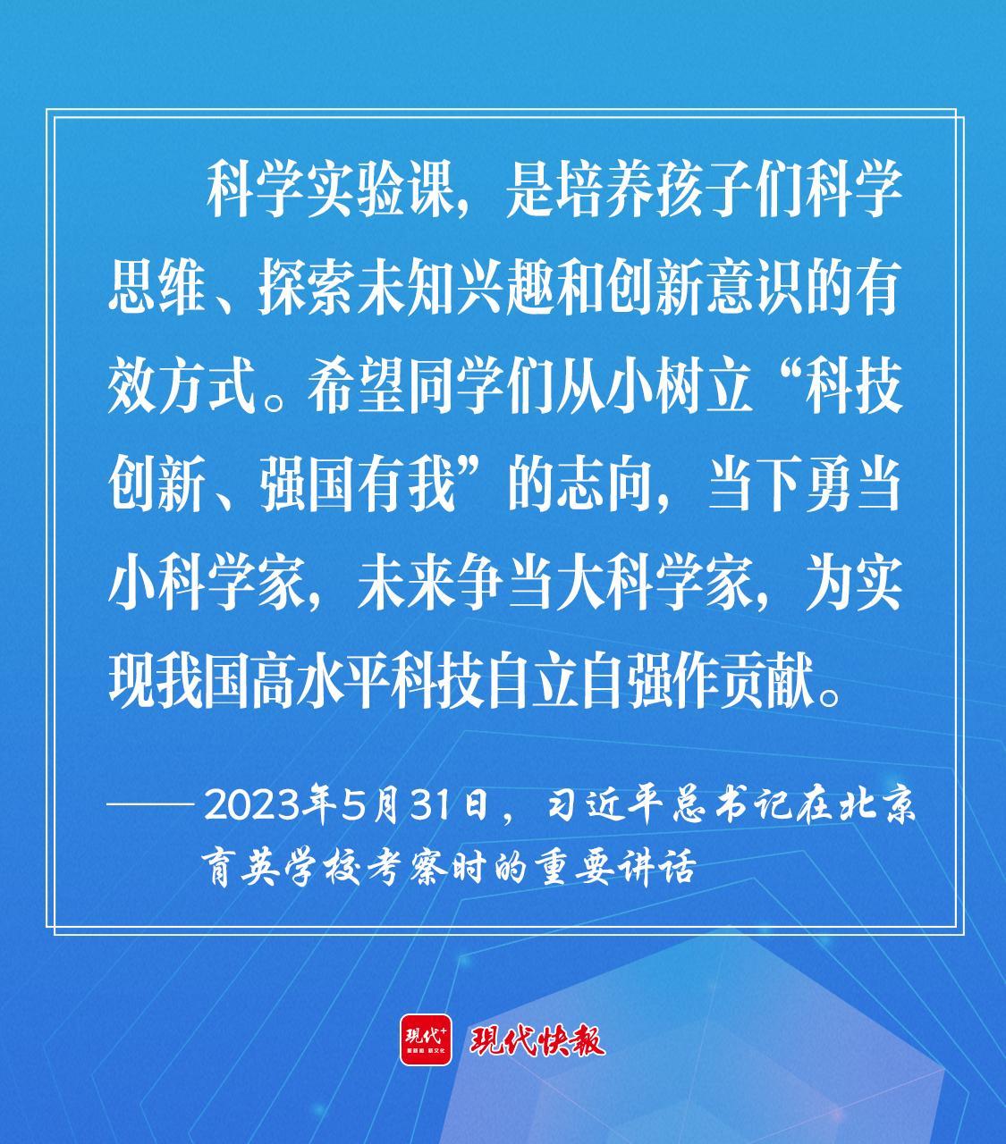 2023年5月,習(xí)近平總書記在北京育英學(xué)??疾鞎r強(qiáng)調(diào),希望同學(xué)們從小樹立“科技創(chuàng)新、強(qiáng)國有我”的志向,當(dāng)下勇當(dāng)小科學(xué)家,未來爭當(dāng)大科學(xué)家,為實(shí)現(xiàn)我國高水平科技自立自強(qiáng)作貢獻(xiàn)。