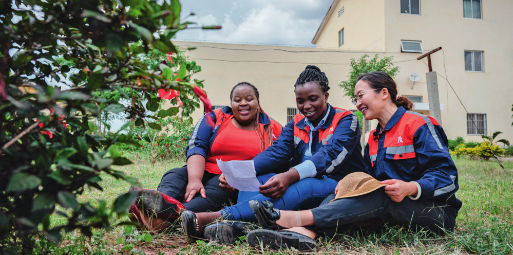 在肯尼亞內(nèi)羅畢,非洲之星鐵路運(yùn)營公司工電部電子設(shè)備檢修工區(qū)工長陳玲(右)在休息時(shí)教學(xué)員唱中文歌曲(2023年5月23日攝) 王冠森攝 / 本刊