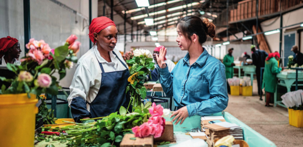 湖南璽悅國際貿(mào)易有限公司負(fù)責(zé)人黃梓楠(右)在肯尼亞納紐基的坦布濟(jì)花卉農(nóng)場(chǎng)挑選鮮花(2024年5月18日攝)王冠森攝 / 本刊