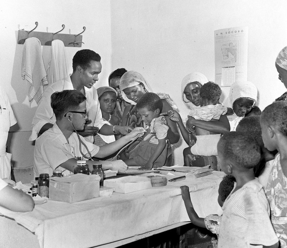 1968年4月,中國(guó)醫(yī)療隊(duì)醫(yī)生在索馬里阿弗戈依鎮(zhèn)巡回醫(yī)療時(shí)為當(dāng)?shù)貎和尾 ?/p>