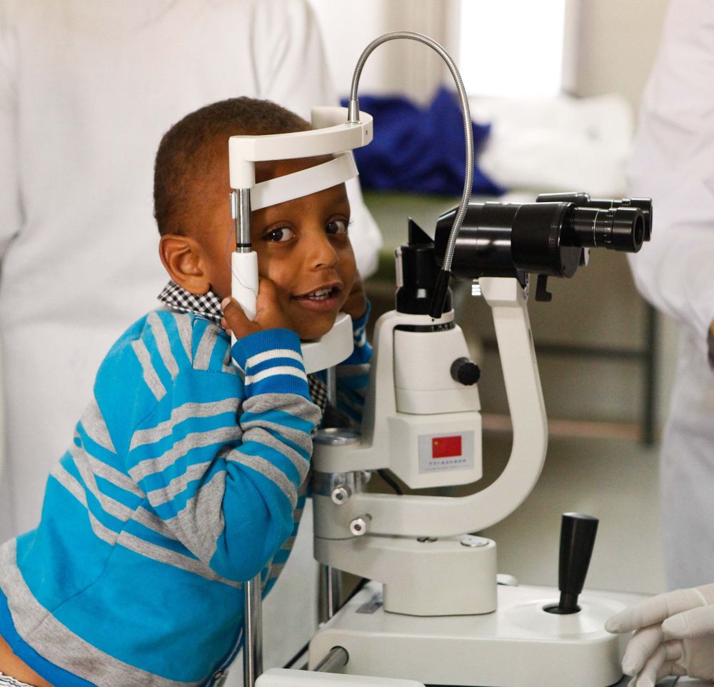 2014年5月2日,在埃塞俄比亞首都亞的斯亞貝巴的阿勒特醫(yī)院,一名小朋友等待參加“光明行”活動(dòng)的中國(guó)眼科專家為他看診。