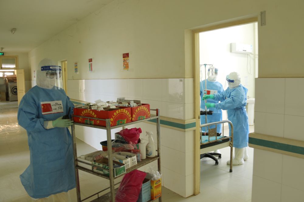 2020年5月26日,在剛果(布)首都布拉柴維爾,中國(guó)抗疫醫(yī)療專家組與當(dāng)?shù)匾痪€醫(yī)務(wù)人員交流,指導(dǎo)新冠肺炎病房建設(shè)。