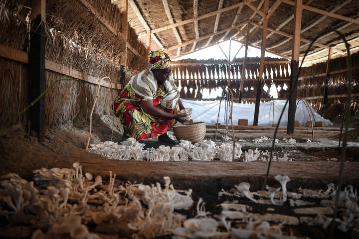 2024年2月6日,在中非共和國(guó)達(dá)馬拉,法蒂瑪在菇棚內(nèi)收獲菌草菇。2022年,法蒂瑪在聽說(shuō)中國(guó)菌草專家在班吉傳授技術(shù)后主動(dòng)前往學(xué)習(xí),從一間小菌棚起步,逐漸擴(kuò)大為如今小有名氣的合作社?!⌒氯A社記者 韓旭 攝