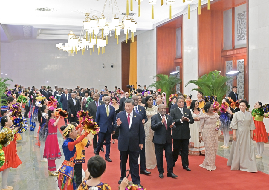 宴會(huì)后,習(xí)近平和彭麗媛同貴賓們共同觀看《攜手同行,共筑未來》文藝演出。演出展現(xiàn)了中非多彩文明美美與共、中非人民相知相親,贏得陣陣熱烈掌聲。