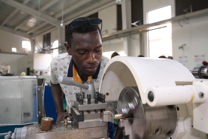2023年1月10日,在加蓬首都利伯維爾的恩考克經(jīng)濟(jì)特區(qū),恩考克國(guó)際職業(yè)教育和培訓(xùn)中心(由中國(guó)航空技術(shù)國(guó)際控股有限公司聯(lián)合成都航空職業(yè)技術(shù)學(xué)院等院校共建)的學(xué)生進(jìn)行車削加工操作訓(xùn)練。新華社記者 韓旭 攝
