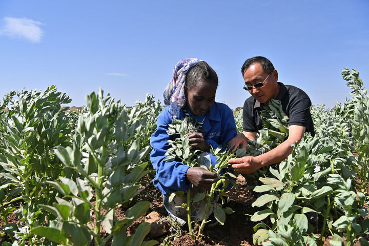 2023年9月27日,在位于厄立特里亞阿斯馬拉的農(nóng)業(yè)技術(shù)援助項(xiàng)目示范地,中國(guó)援厄第三期高級(jí)農(nóng)業(yè)專家組豆類作物專家劉運(yùn)民(右)指導(dǎo)當(dāng)?shù)剞r(nóng)戶進(jìn)行蠶豆作物的田間管理。新華社記者 韓旭 攝