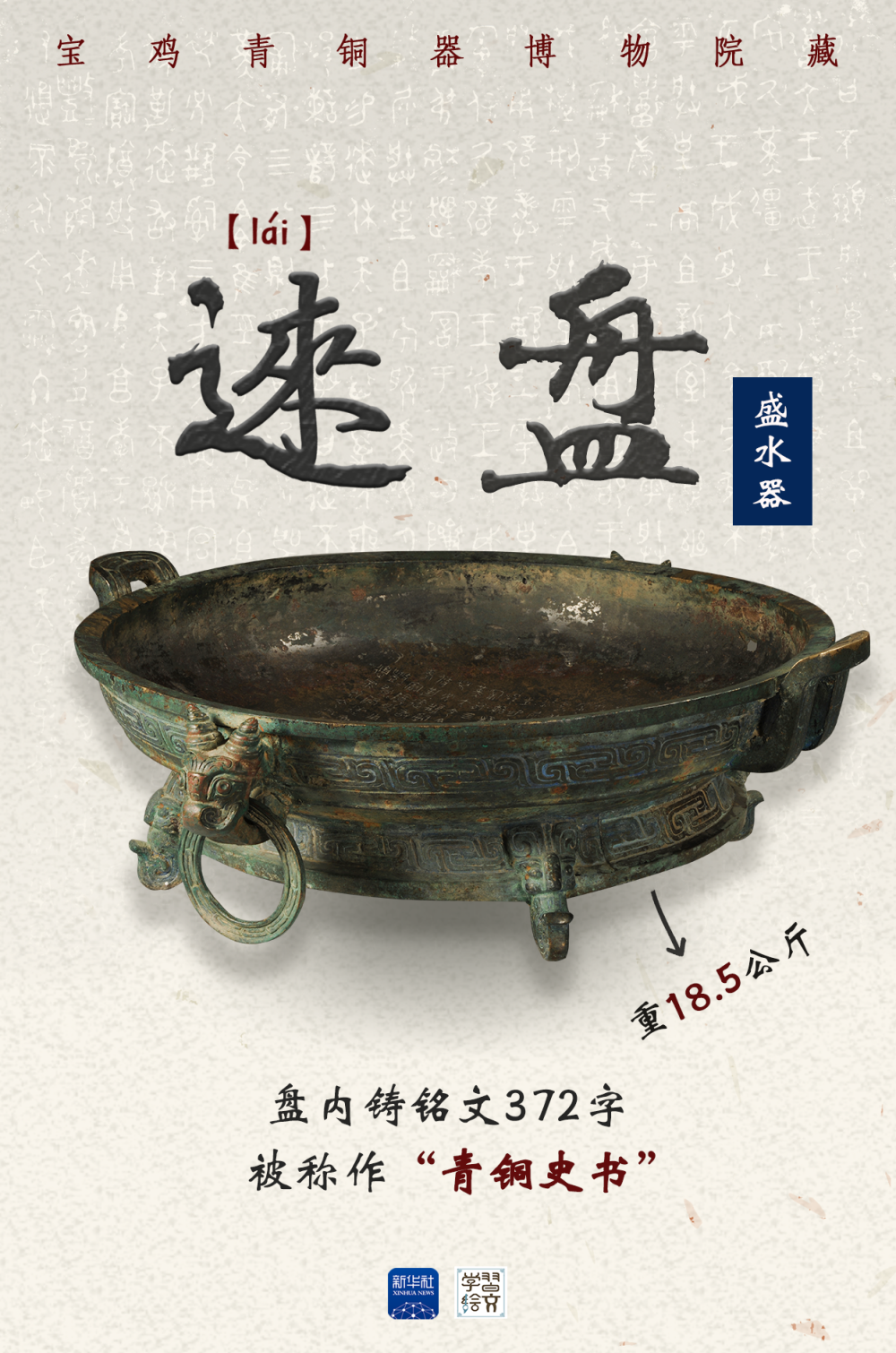 這件青銅器是被稱作“青銅史書”的逨盤。盤內(nèi)鑄銘文372字,完整記錄了單氏家族八代人輔佐西周12位周王征戰(zhàn)、理政、管治林澤的重要史事。從銘文中可看出,周人將家族命運和國家命運緊密結(jié)合,也是后來儒家“修身、齊家、治國、平天下”的思想基礎(chǔ)。