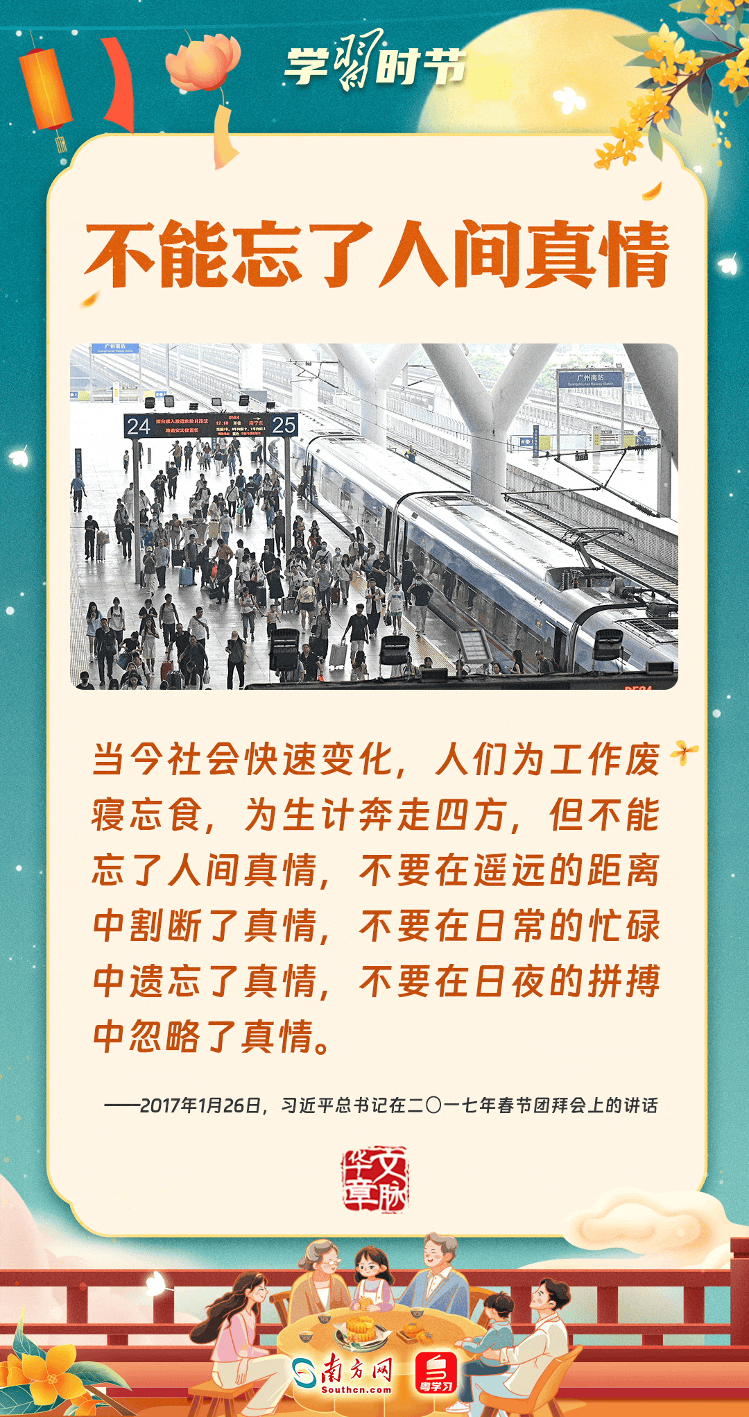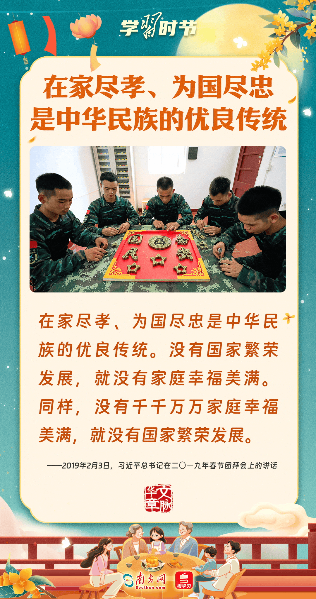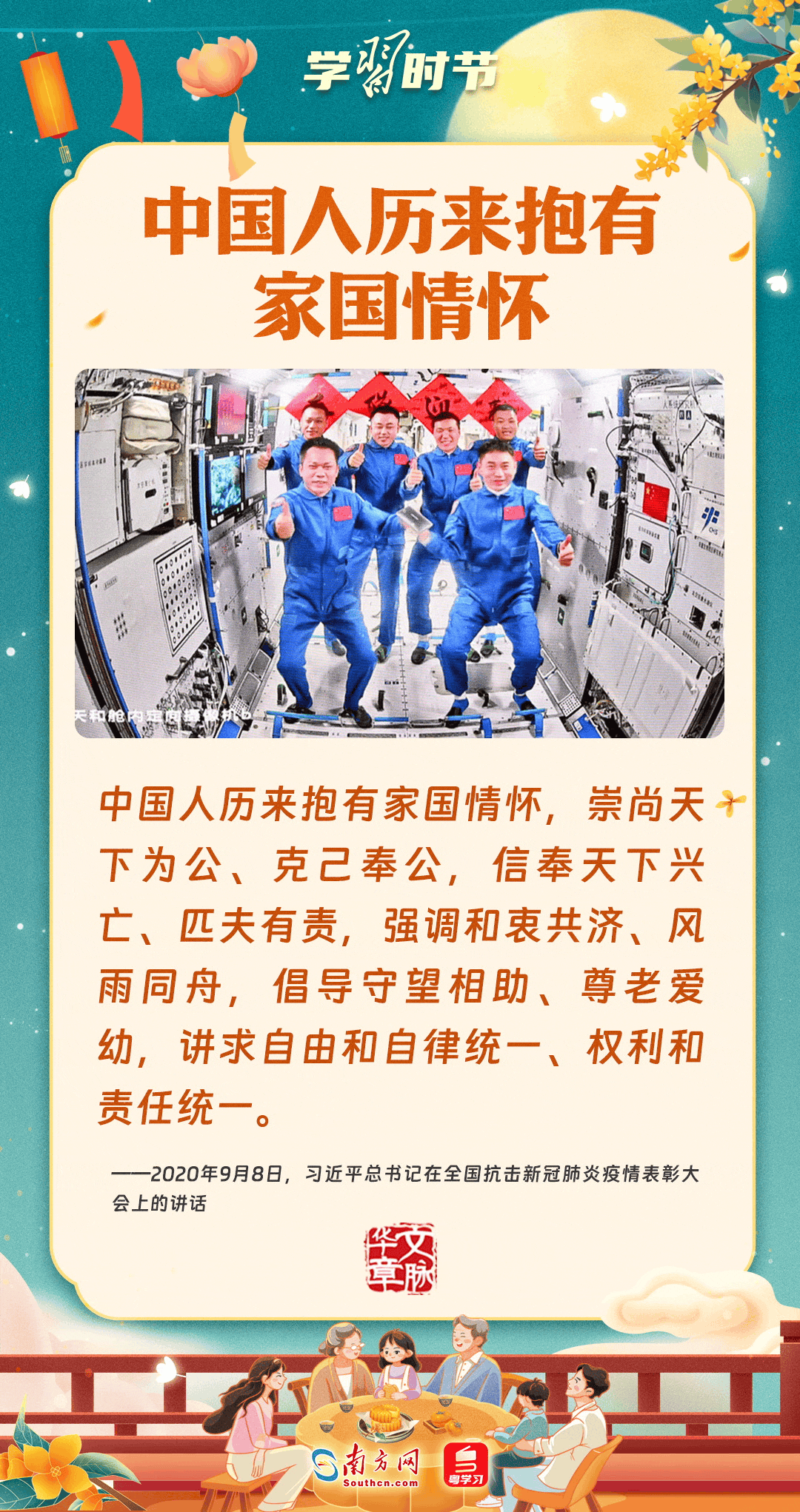 明月寄相思,家國總關(guān)情。作為中華優(yōu)秀傳統(tǒng)文化的重要載體之一,中秋節(jié)不但寄托著海內(nèi)外華人對闔家團圓的美好期許,還承載著深厚的故鄉(xiāng)情、家國情。習(xí)近平總書記曾在多個場合深刻闡述個人、家庭與國家之間的關(guān)系,強調(diào)要厚植家國情懷,把實現(xiàn)個人夢、家庭夢融入國家夢、民族夢之中。中秋佳節(jié),讓我們一起回顧總書記那些經(jīng)典話語,共同感受他至深至厚的家國情懷。
