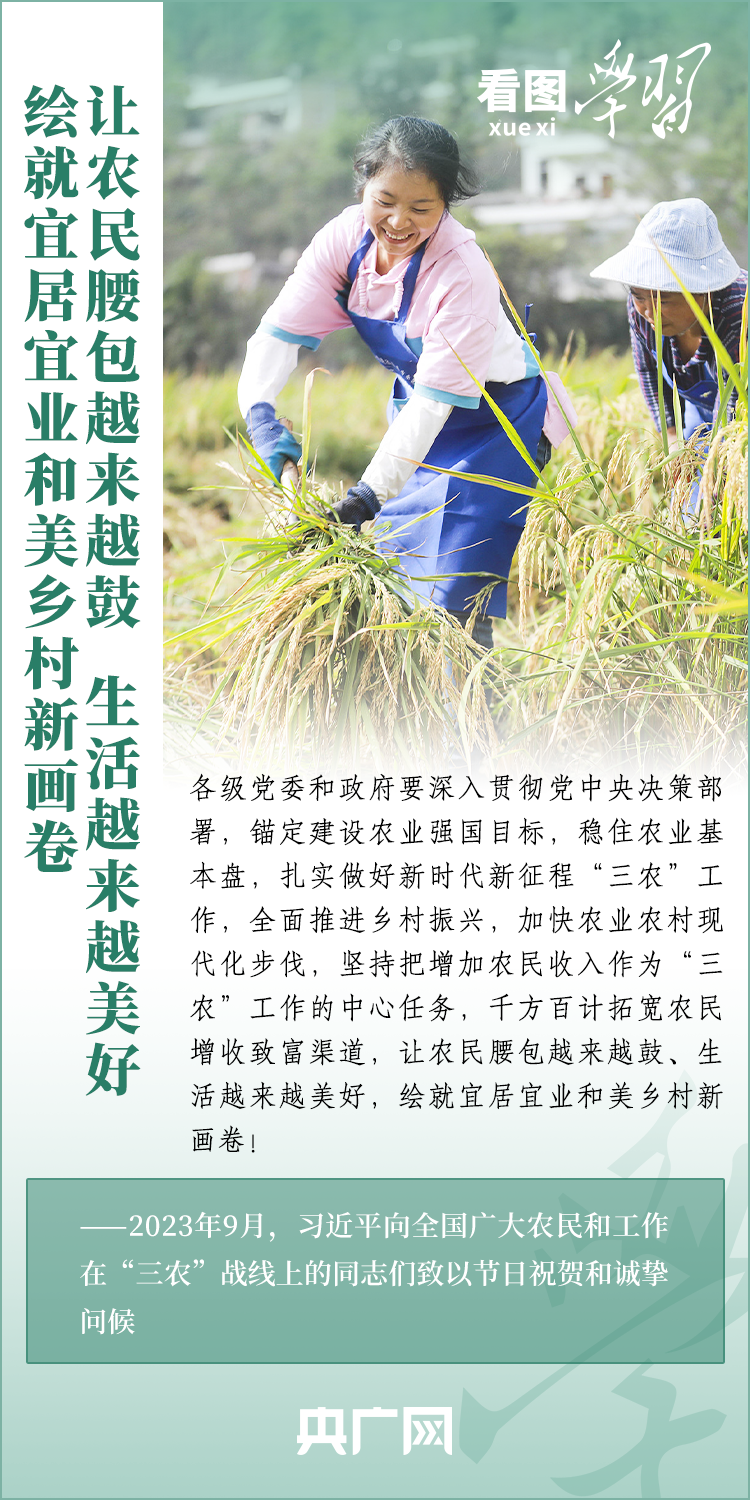 民族要復(fù)興,鄉(xiāng)村必振興。黨的十八大以來(lái),每到各地考察調(diào)研,習(xí)近平總書記總會(huì)去農(nóng)村看一看,走進(jìn)田間地頭,和農(nóng)民拉拉家常。總書記強(qiáng)調(diào),“建設(shè)宜居宜業(yè)和美鄉(xiāng)村是農(nóng)業(yè)強(qiáng)國(guó)的應(yīng)有之義”,“要讓農(nóng)民腰包越來(lái)越鼓、生活越來(lái)越美好”。