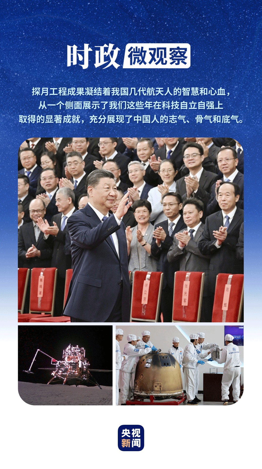 探月工程一路走來,從孫家棟、欒恩杰、歐陽自遠等科技大家,到胡浩、李東、張玉花等航天骨干,一代代航天人攻堅克難、勇攀高峰,共同托舉探月夢、航天夢。以地球搖籃為起點,中國航天人堅持自力更生、自主創(chuàng)新,推動航天事業(yè)從無到有、從弱到強、從“藍圖繪夢”到“奮斗圓夢”,實現(xiàn)歷史性、高質(zhì)量、跨越式發(fā)展,航天強國建設邁出堅實步伐。