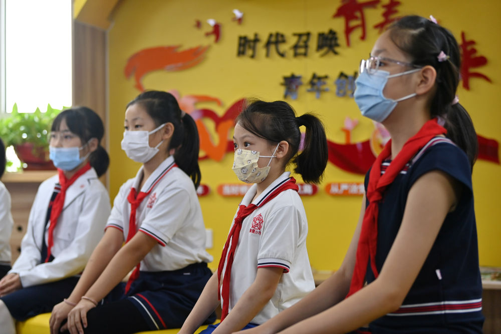 天津市和平區(qū)新星小學(xué)學(xué)生在觀看電影《我和我的祖國(guó)》(2021年9月28日攝)。