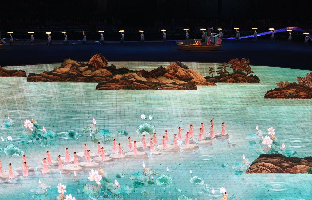 2023年9月23日,演員在杭州亞運(yùn)會(huì)開(kāi)幕式上表演?!肚Ю锝綀D》和《富春山居圖》兩幅國(guó)寶級(jí)名畫,通過(guò)數(shù)字技術(shù),成為移動(dòng)的山水。