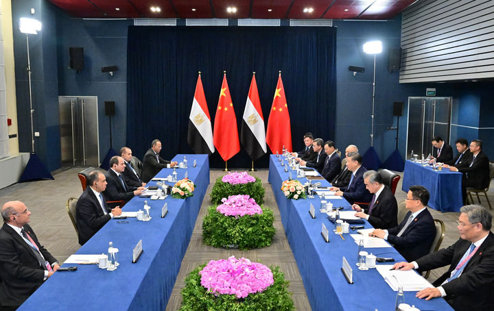 習(xí)近平祝賀并歡迎埃及首次作為正式成員參加金磚國家領(lǐng)導(dǎo)人會(huì)晤。習(xí)近平指出,今年是“中?;锇槟辍焙蛢蓢⑷鎽?zhàn)略伙伴關(guān)系10周年。中方堅(jiān)定支持埃及維護(hù)國家主權(quán)、安全、發(fā)展利益,愿同埃方做守望相助的真誠朋友、攜手發(fā)展的親密伙伴。雙方要繼續(xù)堅(jiān)定相互支持,鞏固政治互信,深化務(wù)實(shí)合作,高質(zhì)量共建“一帶一路”,密切人文交流,推動(dòng)雙邊關(guān)系朝著構(gòu)建面向新時(shí)代的中埃命運(yùn)共同體目標(biāo)持續(xù)邁進(jìn)。中方也愿同埃方加強(qiáng)協(xié)調(diào),推動(dòng)“大金磚合作”行穩(wěn)致遠(yuǎn),進(jìn)一步提升全球南方影響力和發(fā)言權(quán),維護(hù)發(fā)展中國家共同利益。