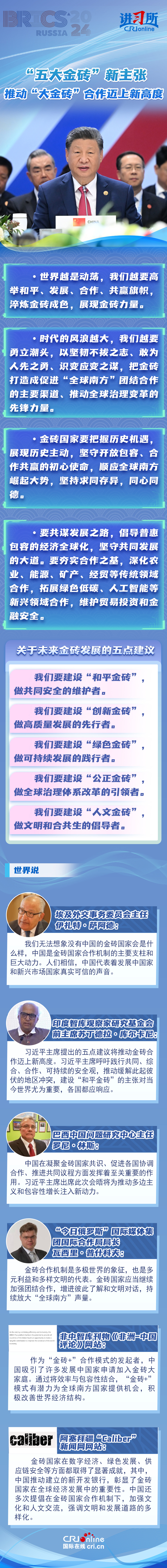 “時(shí)代的風(fēng)浪越大,我們?cè)揭铝⒊鳖^,以堅(jiān)韌不拔之志、敢為人先之勇、識(shí)變應(yīng)變之謀,把金磚打造成促進(jìn)‘全球南方’團(tuán)結(jié)合作的主要渠道、推動(dòng)全球治理變革的先鋒力量?!碑?dāng)?shù)貢r(shí)間10月23日,習(xí)近平主席在俄羅斯喀山出席金磚國(guó)家領(lǐng)導(dǎo)人第十六次會(huì)晤并發(fā)表重要講話,提出共建“和平金磚”“創(chuàng)新金磚”“綠色金磚”“公正金磚”“人文金磚”,為“大金磚合作”擘畫(huà)藍(lán)圖。