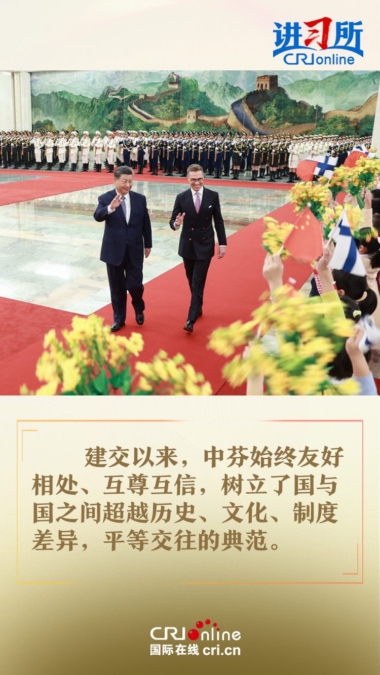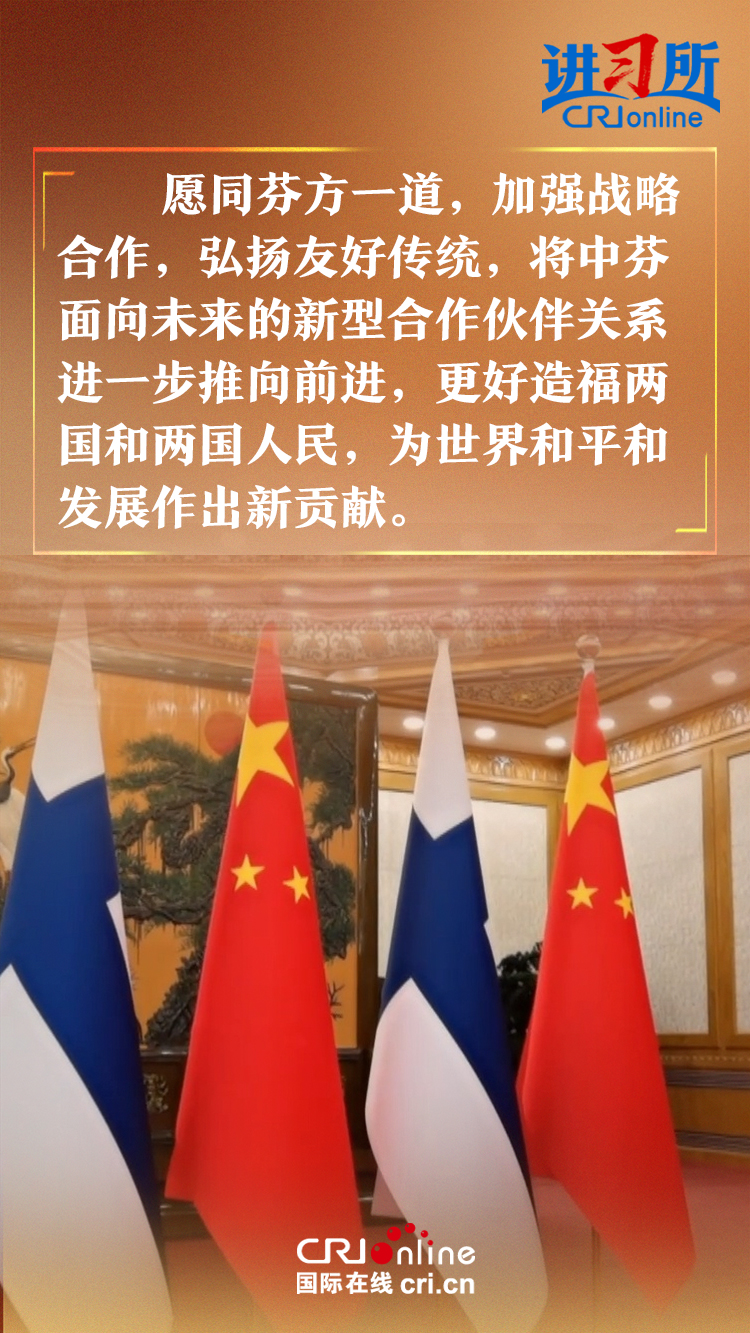 習(xí)近平指出,建交以來(lái),中芬始終友好相處、互尊互信,樹立了國(guó)與國(guó)之間超越歷史、文化、制度差異,平等交往的典范。中方愿同芬方一道,加強(qiáng)戰(zhàn)略合作,弘揚(yáng)友好傳統(tǒng),將中芬面向未來(lái)的新型合作伙伴關(guān)系進(jìn)一步推向前進(jìn),更好造福兩國(guó)和兩國(guó)人民,為世界和平和發(fā)展作出新貢獻(xiàn)。