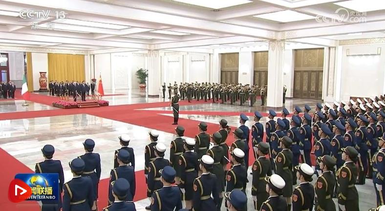 天安門廣場鳴放21響禮炮,禮兵列隊致敬。兩國元首登上檢閱臺,軍樂團(tuán)奏中意兩國國歌。馬塔雷拉在習(xí)近平陪同下檢閱中國人民解放軍儀仗隊,并觀看分列式。