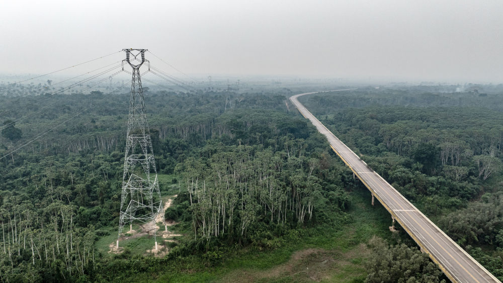 這張9月13日拍攝的照片顯示,在巴西朗多尼亞州,EDP輸變電項目線路穿越熱帶雨林(無人機(jī)照片)。巴西EDP輸變電項目是位于巴西北部的阿克里州和朗多尼亞州的綠地輸變電工程,山東電建一公司承擔(dān)了該項目的EPC總承包任務(wù)。新華社記者王天聰攝