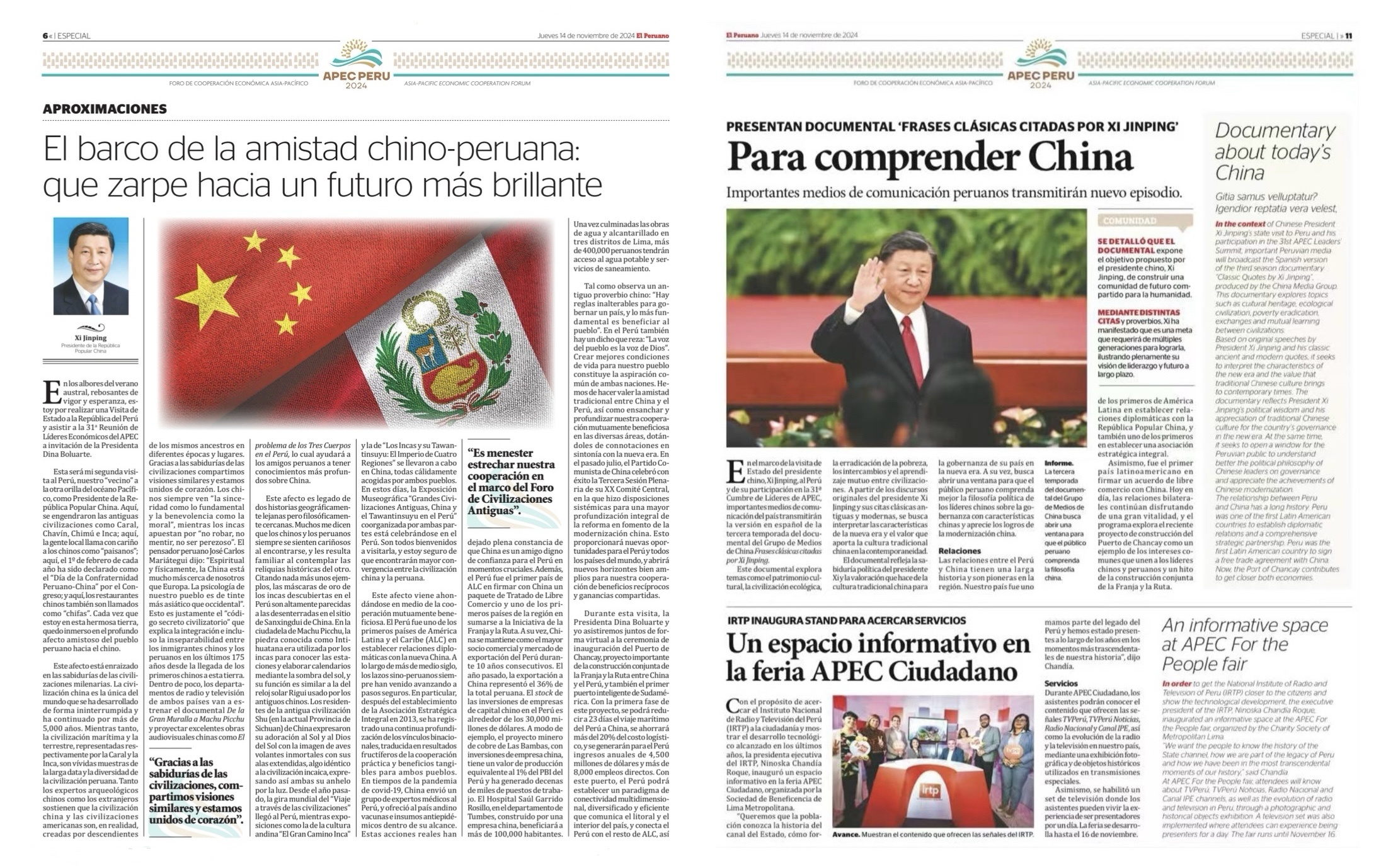 在中國(guó)國(guó)家主席習(xí)近平應(yīng)秘魯共和國(guó)總統(tǒng)博魯阿爾特邀請(qǐng),赴利馬出席亞太經(jīng)合組織第三十一次領(lǐng)導(dǎo)人非正式會(huì)議并對(duì)秘魯進(jìn)行國(guó)事訪問(wèn)之際,由中國(guó)中央廣播電視總臺(tái)制作的《平“語(yǔ)”近人——習(xí)近平喜歡的典故》第三季(西班牙語(yǔ)版),將于當(dāng)?shù)貢r(shí)間11月14日起在秘魯國(guó)家廣播電視臺(tái)、秘魯電視聯(lián)播網(wǎng)、秘魯廣播節(jié)目集團(tuán)電視端等多平臺(tái)落地播出。當(dāng)?shù)囟嗉抑髁髅襟w對(duì)節(jié)目落播進(jìn)行預(yù)告,引發(fā)秘魯各界普遍期待和廣泛關(guān)注。