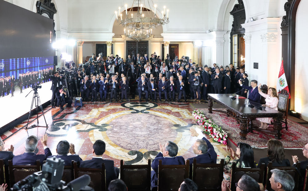 當地時間11月14日晚7時許,秘魯首都利馬總統(tǒng)府一層埃萊斯普魯廳,燈火通明,氣氛熱烈。習近平主席同秘魯總統(tǒng)博魯阿爾特以視頻方式共同出席秘魯錢凱港開港儀式。
